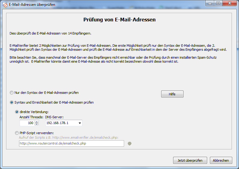 Die Verwendung der direkten Abfrage beim zuständigen Server sollte nur verwendet werden, wenn eine feste IP-Adresse verwendet wird, dass heißt keine dynamische Einwahl-IP-Adresse wie diese bei Analog-Modem-, ISDN- und DSL-Verbindungen verwendet wird. Um die Prüfung trotzdem verwenden zu können kann ein PHP-Script auf die eigene Webseite (Webspace mit Unterstützung für PHP4/5-Script Voraussetzung) geladen werden und E-MailVerifier dieses Script zur Prüfung der E-Mail-Adressen verwenden.